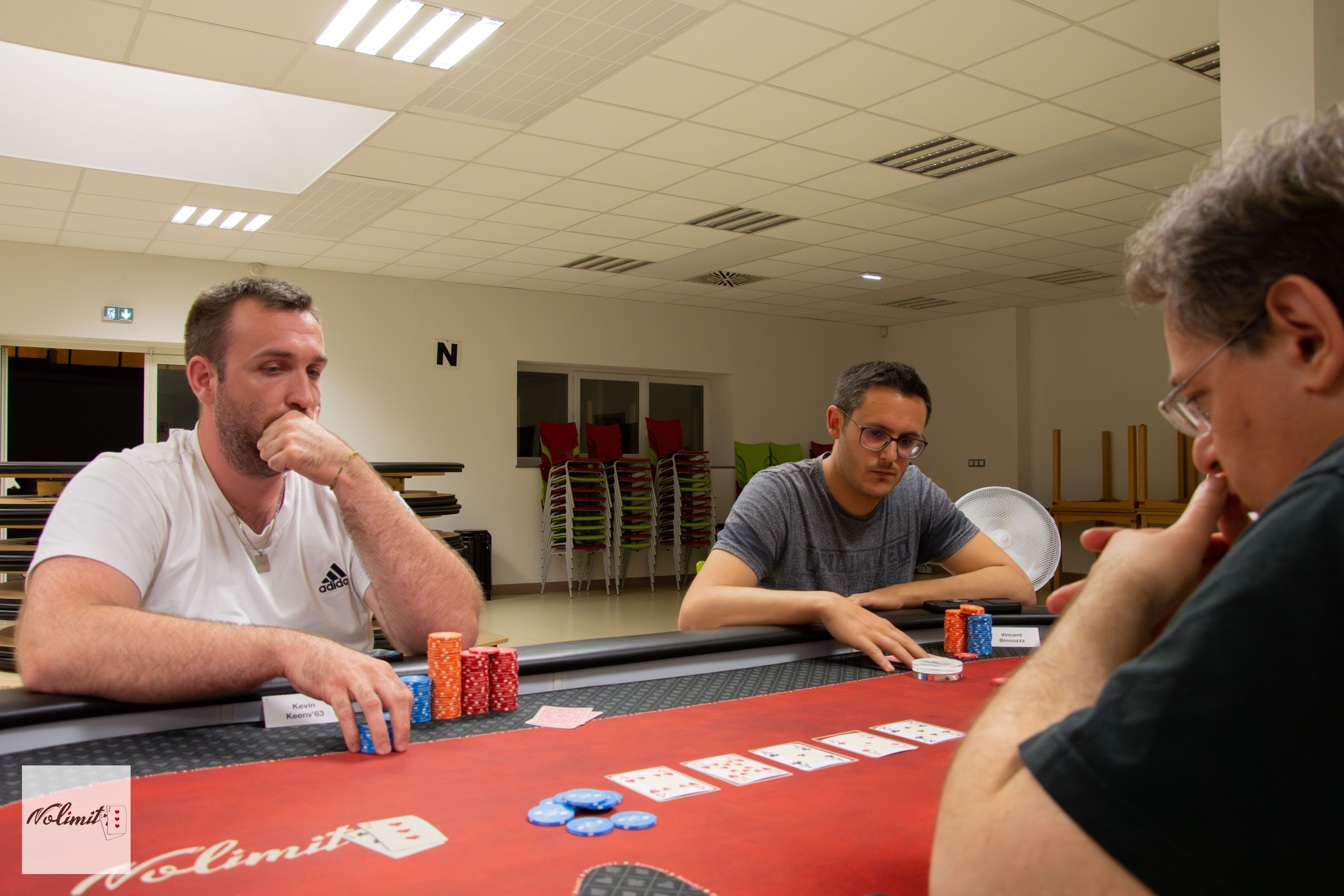 Après 45 minutes de TF les blindes sont passées à 13k / 25k lorsque Kevinho et Warnerman se retrouvent en bataille de blindes : limp de Kévin en SB, relance 75k de Nicolas, call.