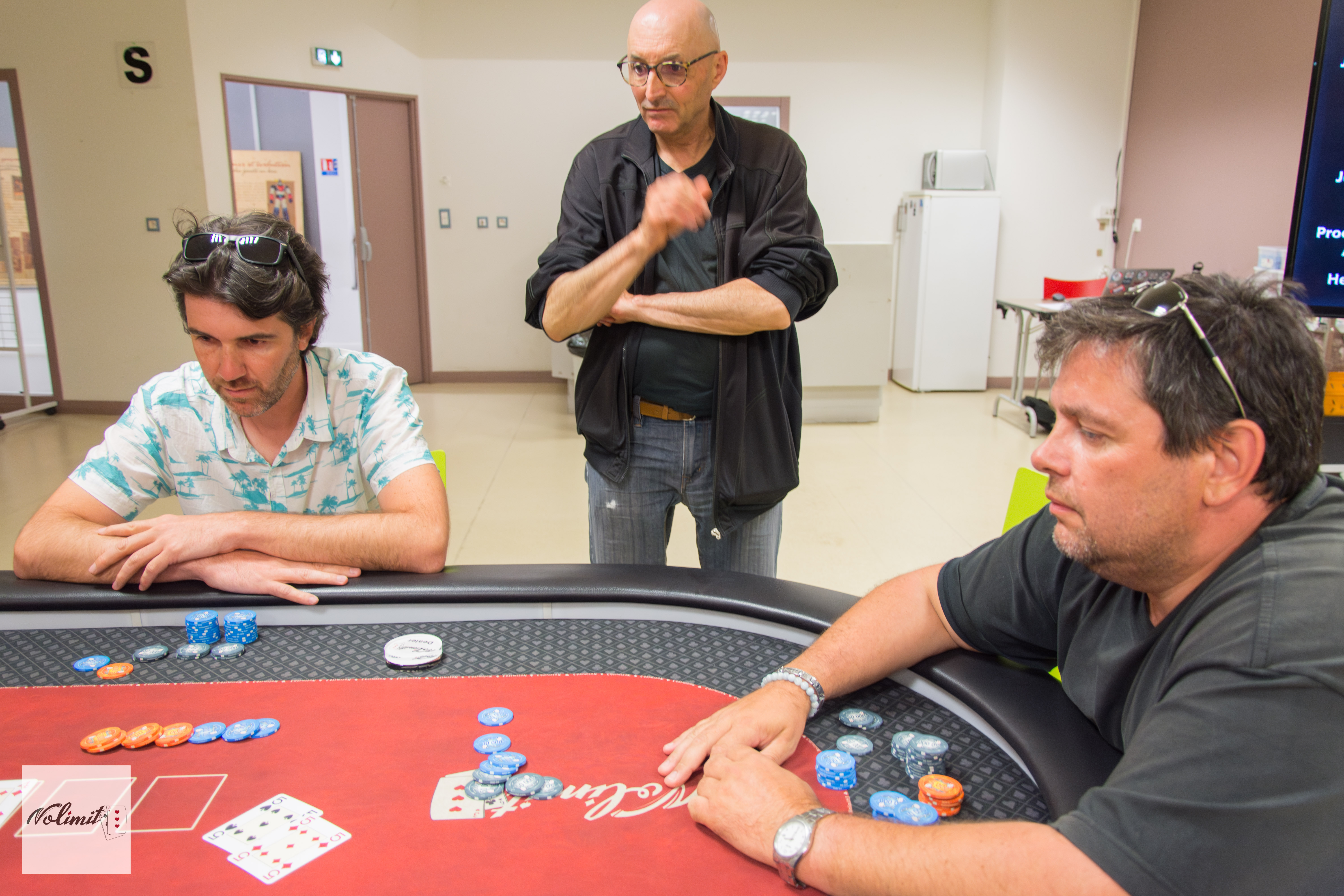 Il est 18h, le croupier, le floor et les 3 joueurs restants sont fatigués après 2 jours intenses de poker et 3h de TF. Les 3 survivants, calmes depuis 40 minutes, décident soudainement d’accélérer. Cela va tellement vite que le couvreur n’a pas le temps de noter tous le dérouler préflop, toujours est t’il que tout le monde se retrouve à tapis avant le flop :