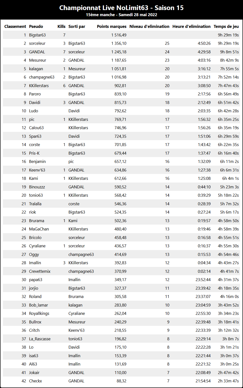 https://site.nolimit63.com/?action=ClassementGeneral Benjamin est bien parti pour la victoire, mais Kévin et Bastien sont en embuscade et guettent le faux pas. Avec une victoire autour de 1500 points (suivant le nombre de participants) tout est possible : les suspens est entier.