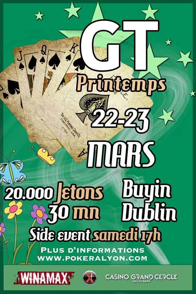 Venez fêter avec nous la fin de l'hiver les 22 et 23 mars autour d'une de nos tables avec 20.000 jetons et des niveaux de 30mn. Pour célébrer le retour du printemps, le vainqueur de ce Grand Tournament repartira avec un buyin pour aller jouer là où tout est vert toute l'année : Dublin.
