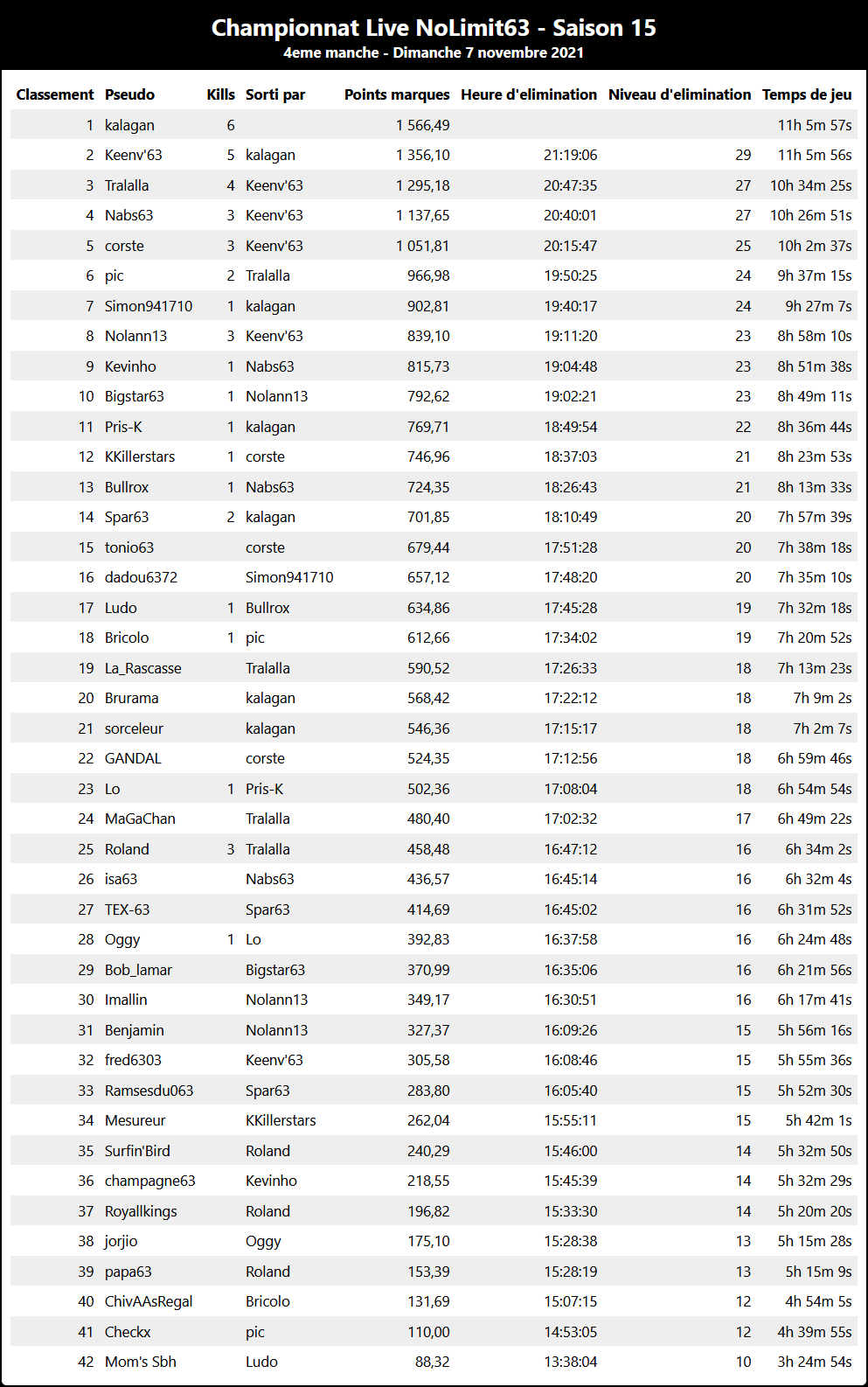 Au classement général Kévin prend la tête malgré une manche de moins que ses principaux poursuivants : https://site.nolimit63.com/?action=ClassementGeneral