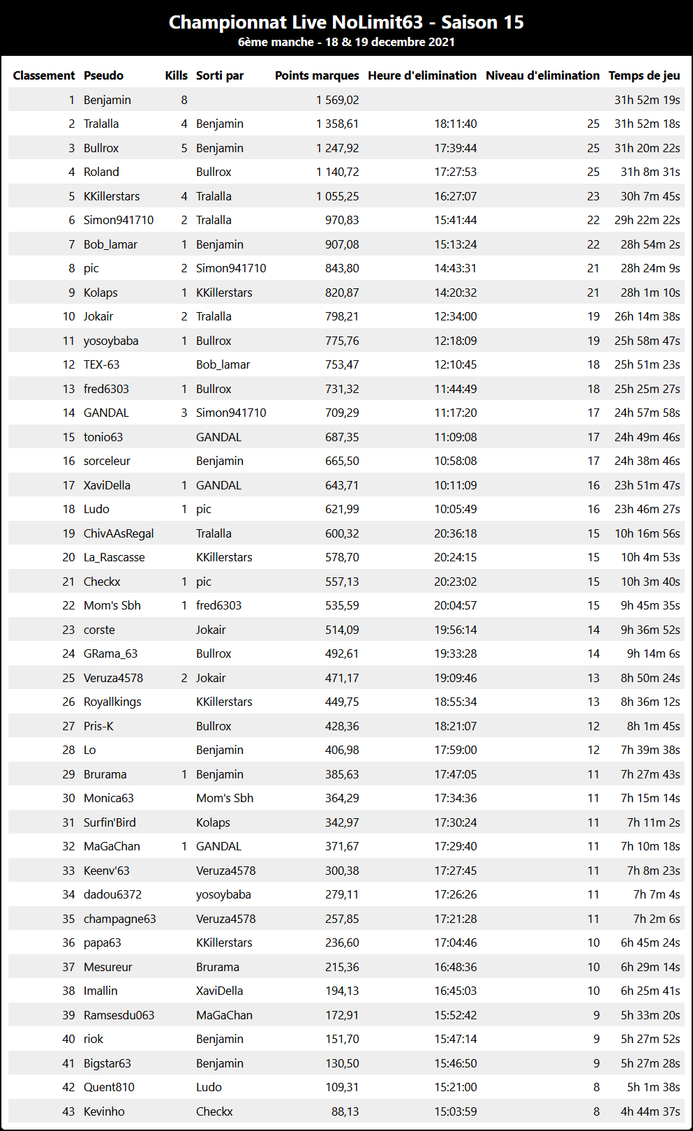 Et le classement killer est ici : https://site.nolimit63.com/?action=ClassementKiller