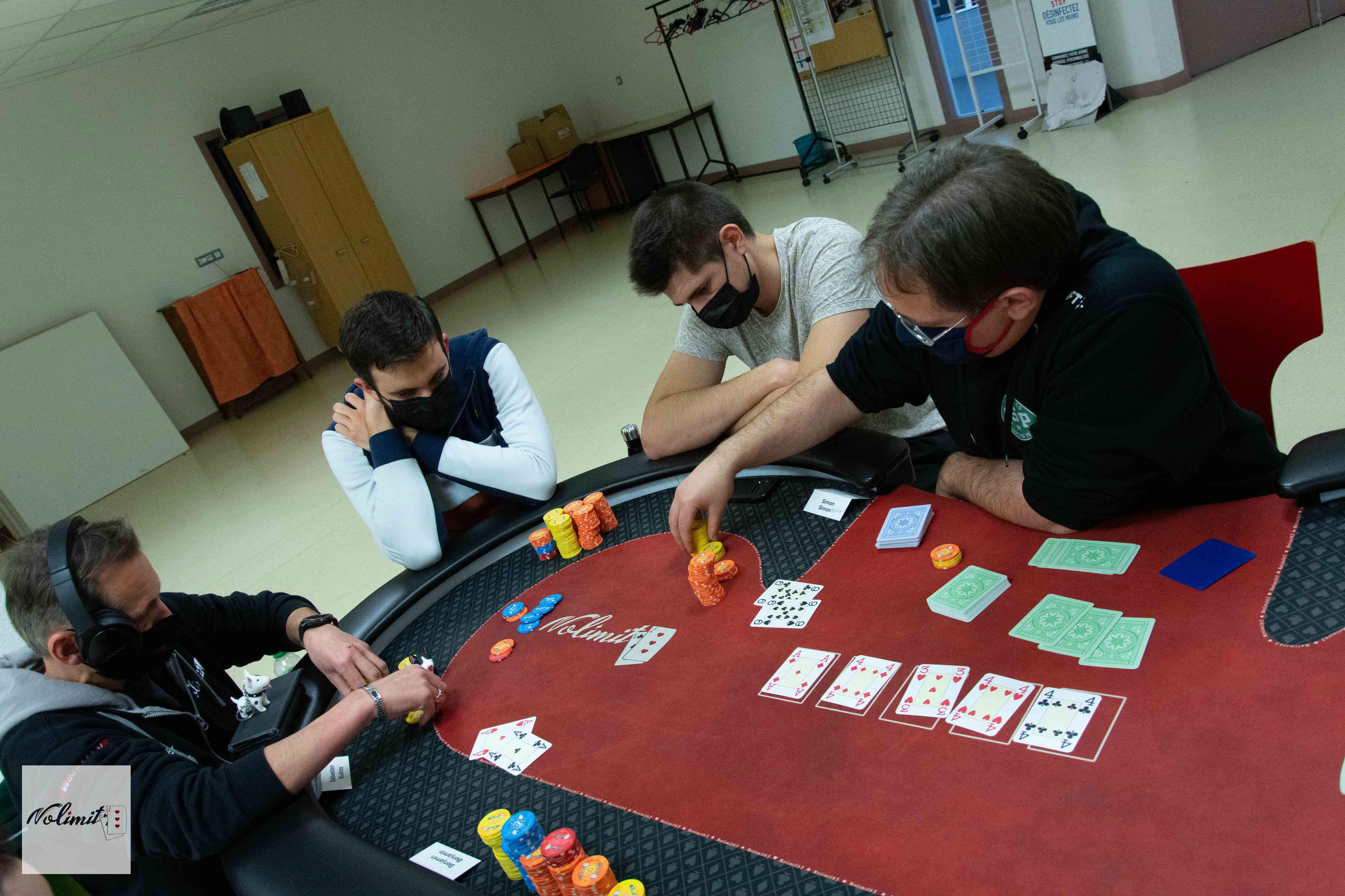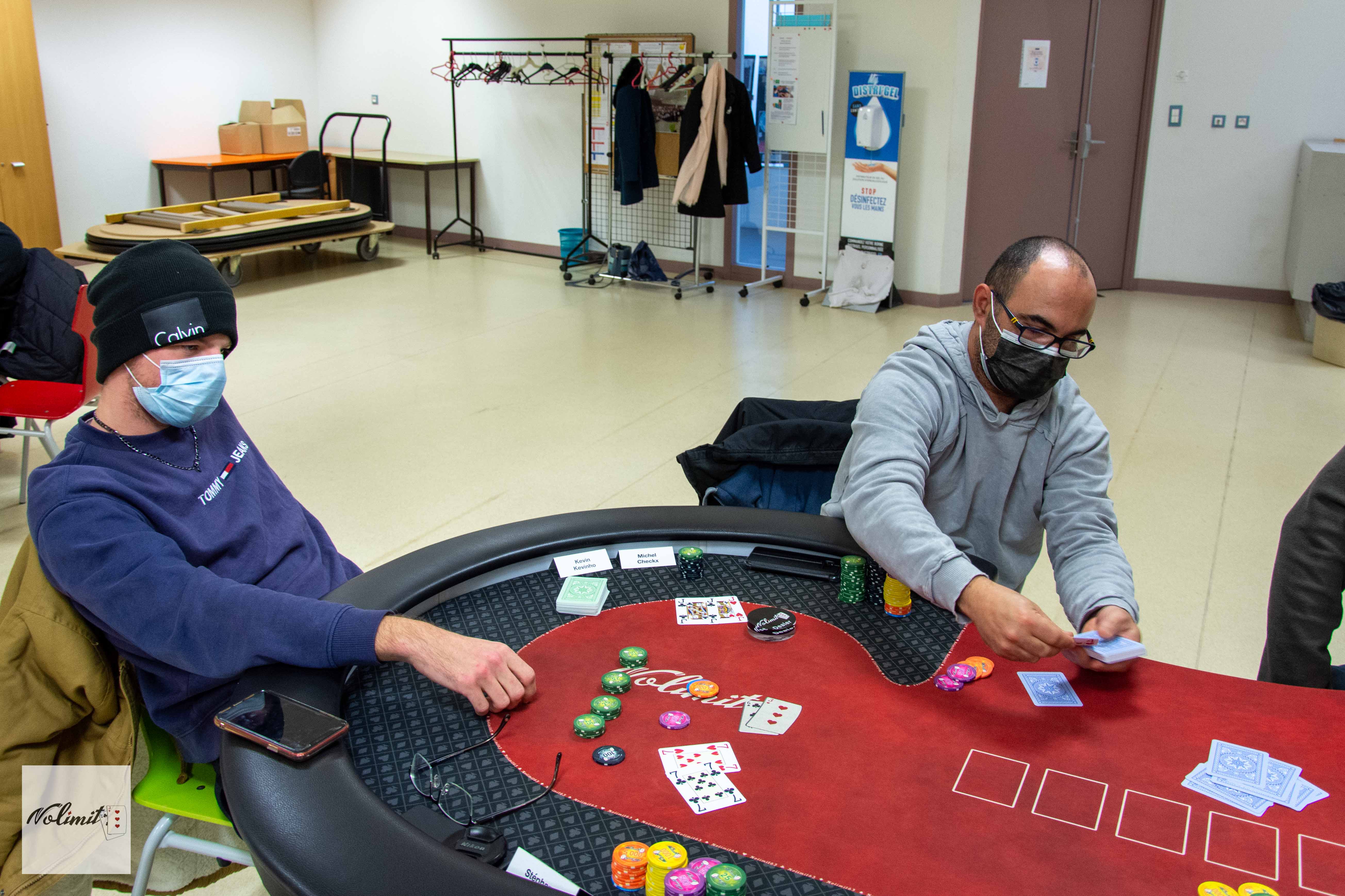 Table 1 , blindes 250/500: Kevinho au CO entre en jeu en étant le 3éme limper, Checkx au bouton décide de raise, il est caller par les 2 premiers limper. Kévin sentant peut-être la bonne affaire décide de tout envoyer au milieu, soit 16000 jetons. Après un moment de réflexion Checkx call, montrant une paire de Valets, Kevinho avec une paire de 7 n’améliorera pas et sort du tournoi.