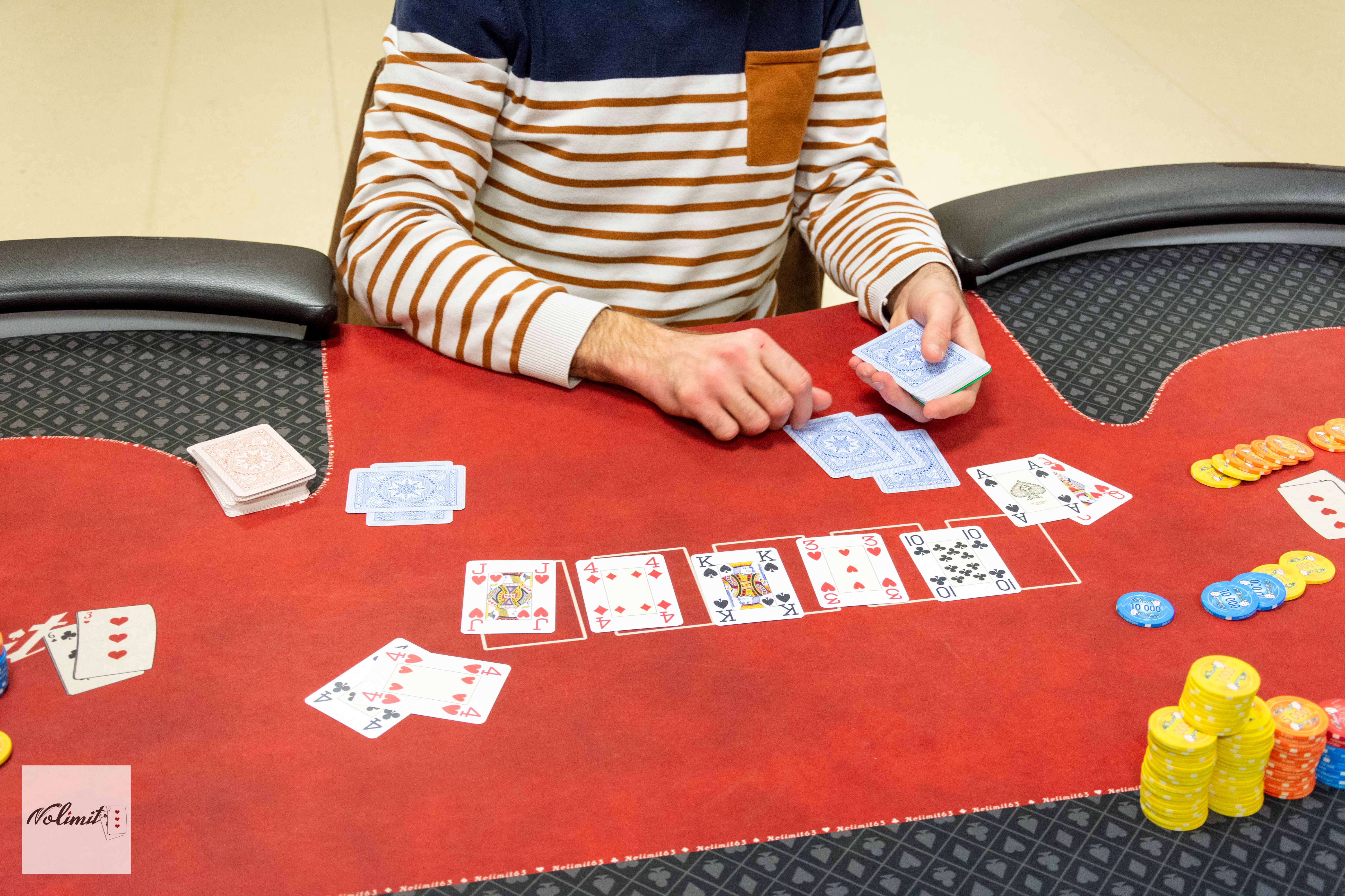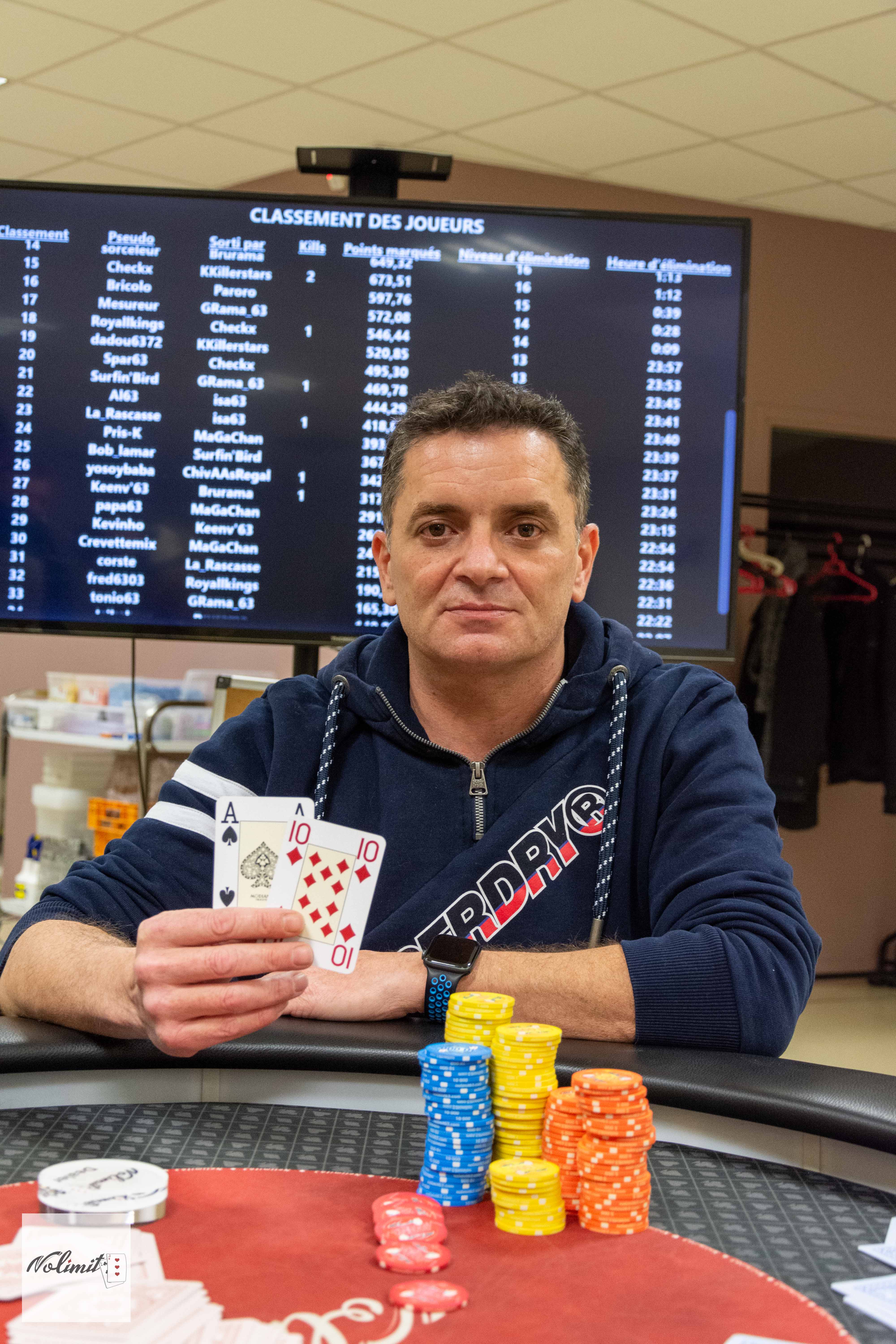 Le bullard du jour est Brurama : il pousse K9s au bouton, Paroro en BB va réfléchir longuement avant de call en montrant AJo. Cette fois Bruno n’inverse pas les probabilités et termine 8éme.